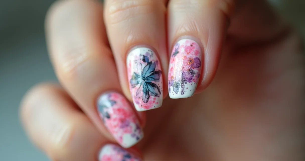 Visão superior de unhas com blindagem de unha decorada, apresentando desenhos florais delicados em tons pastel, com foco na textura lisa e uniforme da superfície.