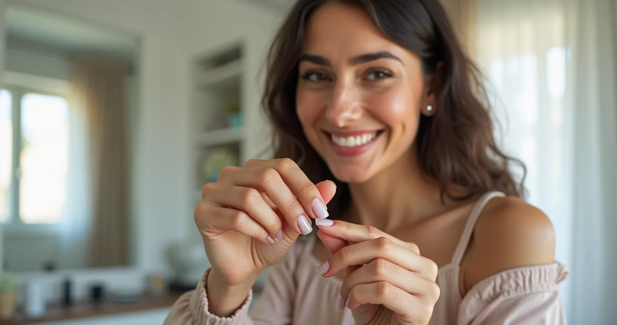 4. Passo 4: Pressionar e Secar – Junte as partes da unha quebrada com delicadeza e pressione firmemente por uns 15 a 30 segundos. A cola de cianoacrilato seca super rápido, mas esse tempo é crucial para garantir uma boa adesão. Sinta a unha ficar firme.