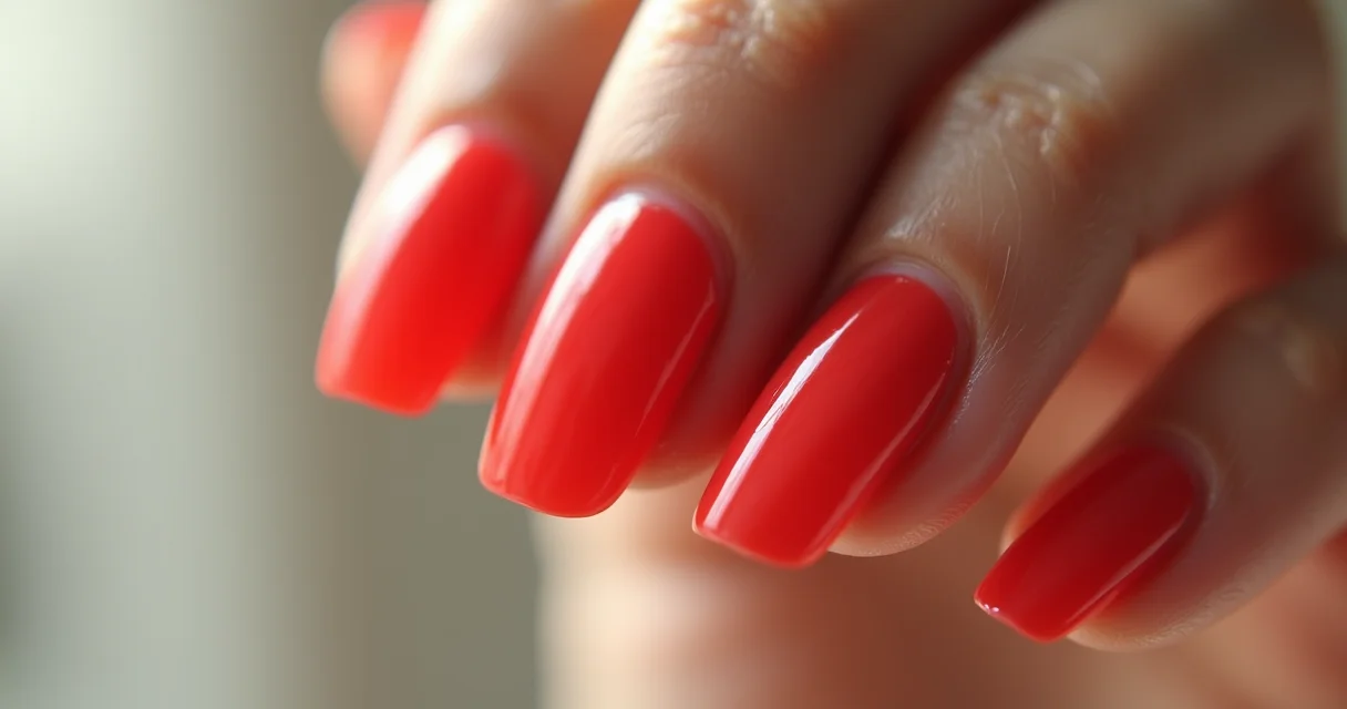 Mão com unhas curtas em formato amendoado, aplicadas com esmalte em gel vermelho vibrante, com iluminação lateral que realça o brilho intenso.