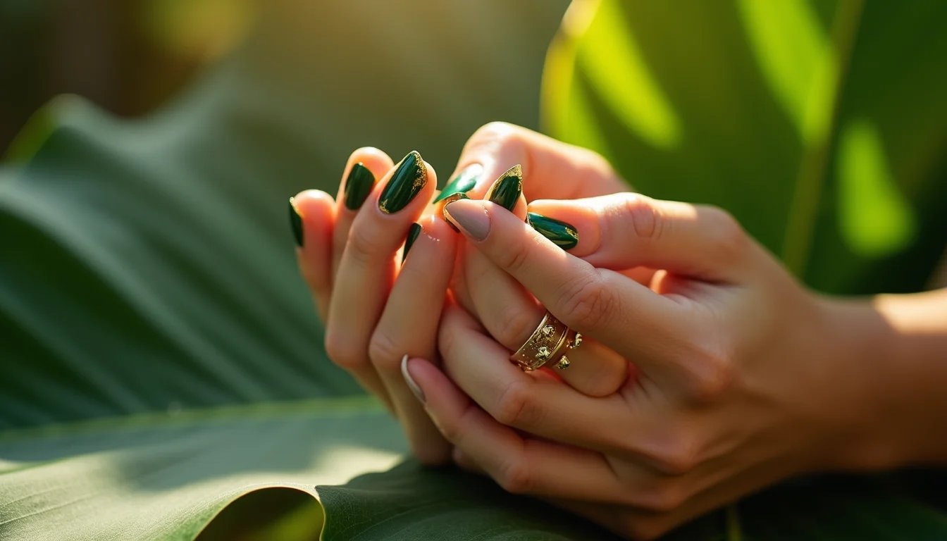 O verde floresta em unhas stiletto alonga os dedos com elegância natural.