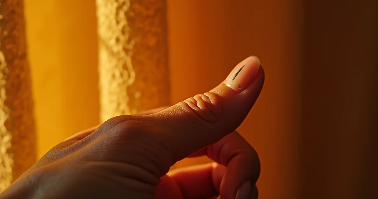Aqui está o detalhe que pode salvar sua unha: a principal característica é uma mancha escura na unha, que geralmente aparece como uma faixa vertical. Pense numa linha que vai da cutícula até a ponta da unha.