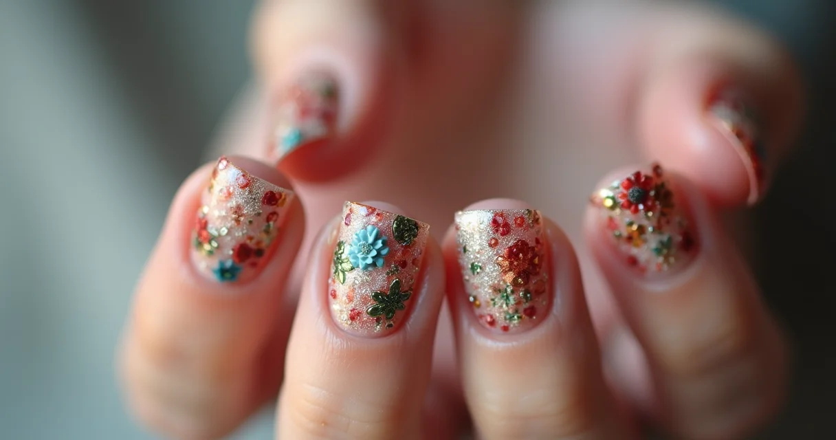 - Unhas com glitter encapsulado em diferentes cores: misturas de glitter para um efeito único.