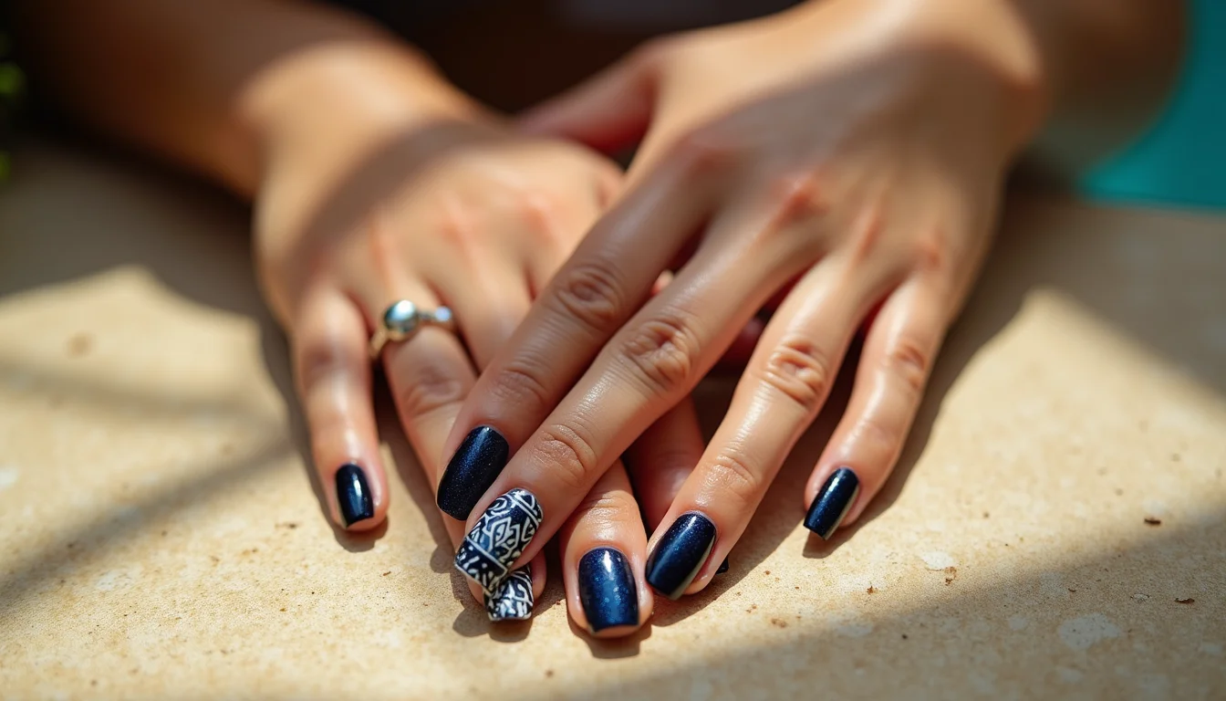 Usar esmalte metálico dourado em algumas unhas ou como detalhe em desenhos sobre o azul escuro e branco. O brilho intenso do dourado contra o azul escuro é impactante.