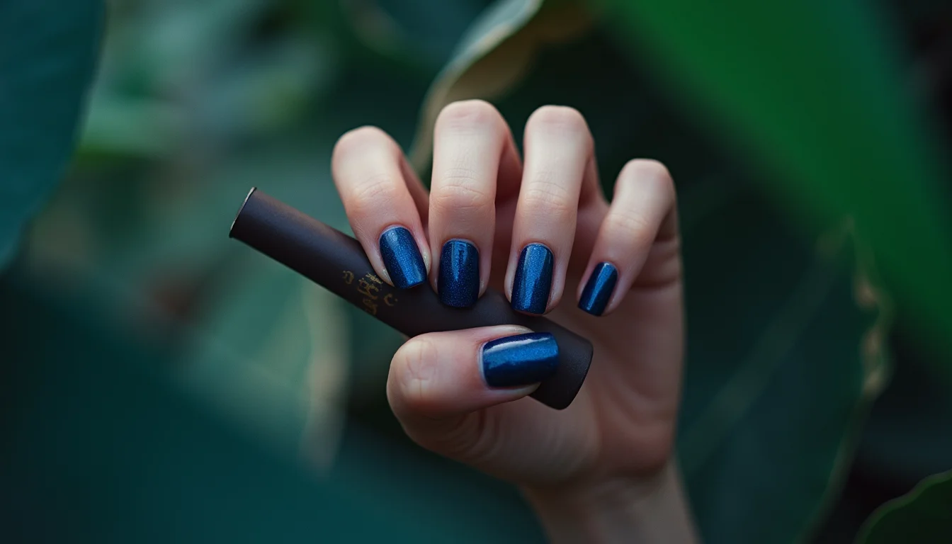 A textura cintilante em esmaltes azul escuro adiciona profundidade e um brilho sutil, ideal para quem gosta de detalhes.