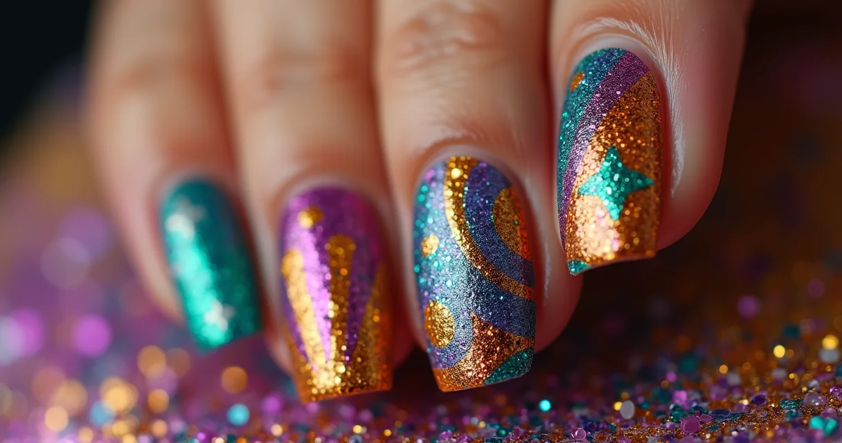 A nail art temática, com desenhos de confetes, máscaras ou até mesmo personagens, adiciona um charme extra e divertido às unhas.