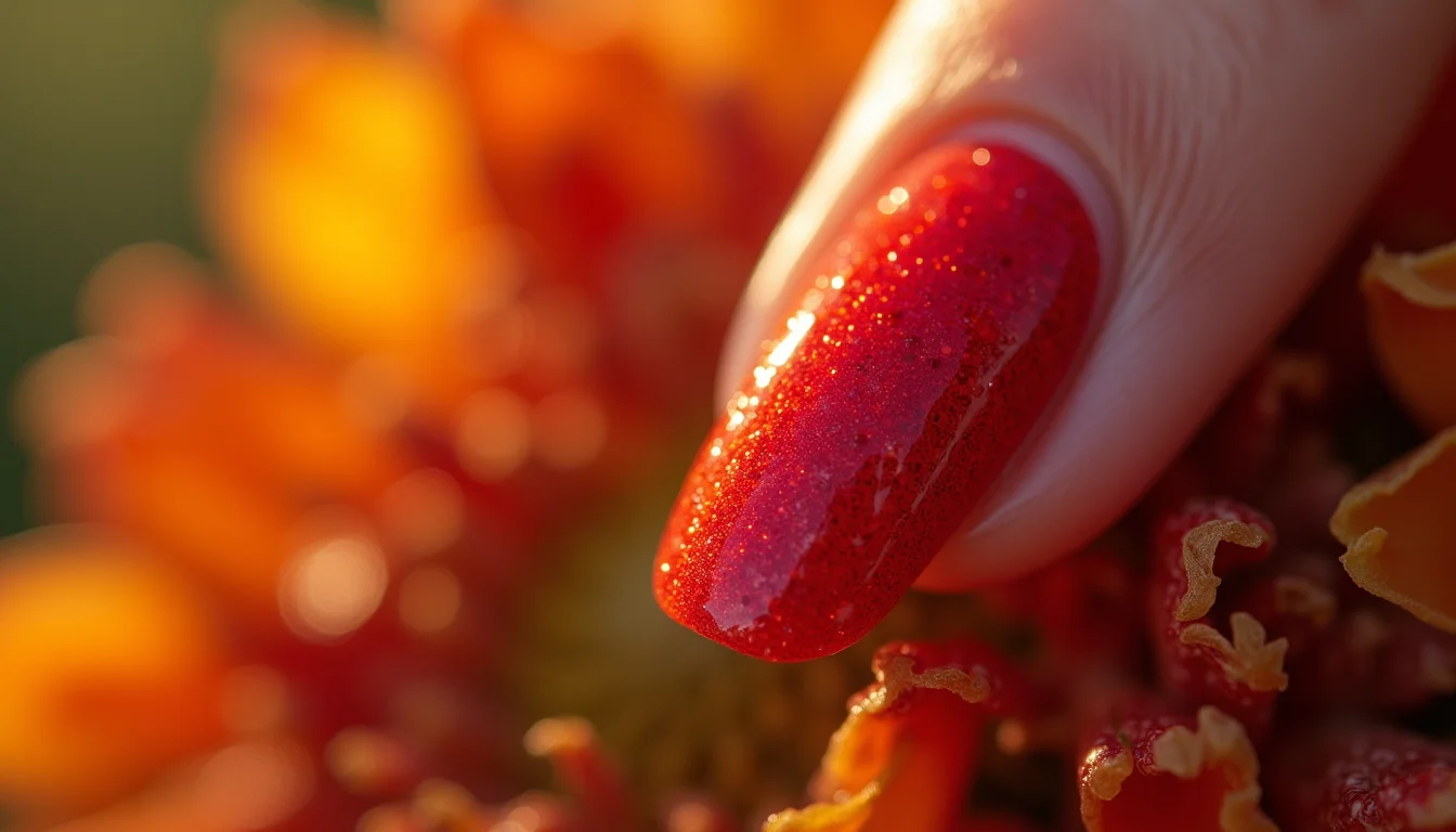 Unhas vermelhas encapsuladas com glitter fino criam um efeito cintilante sutil e elegante, com ótima durabilidade.
