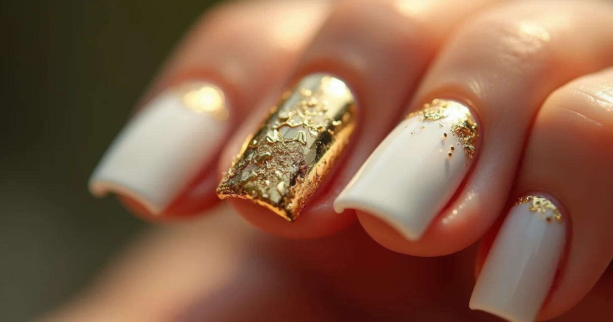 A aplicação de glitter dourado sobre o branco pode transformar uma unha simples em uma peça de arte, adicionando textura e brilho.
