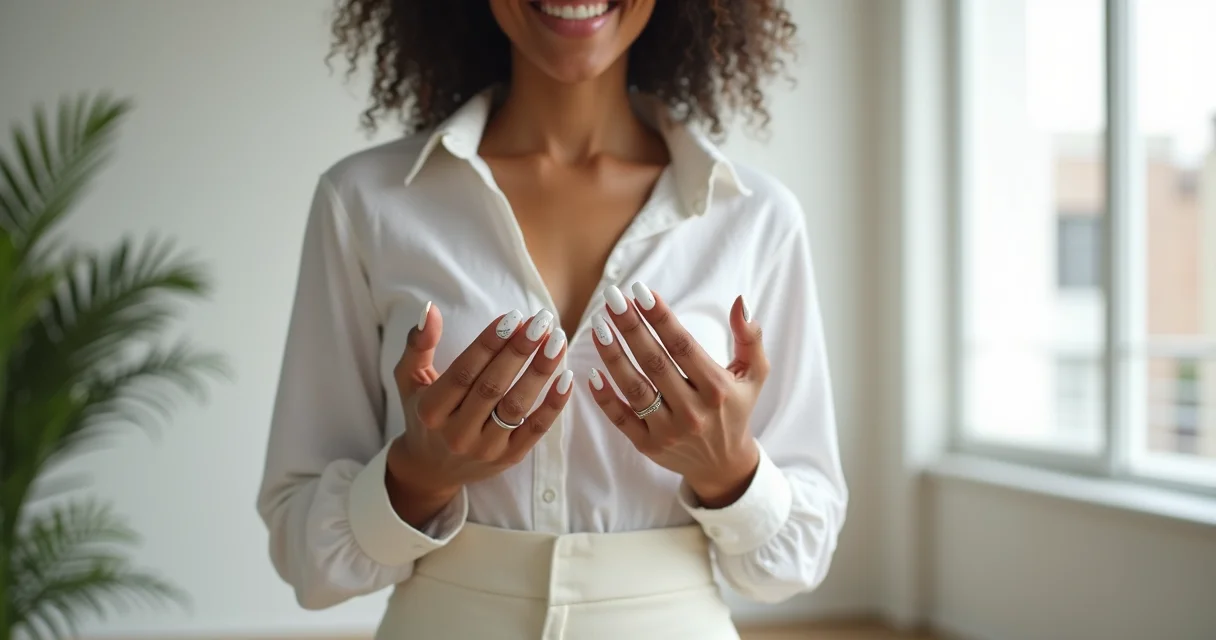 Quer um exemplo? Uma única linha fina em prata ou dourado na base da unha, ou um pequeno ponto de luz discreto, já eleva o visual. O formato oval é universalmente lisonjeiro e, combinado com um branco impecável, alonga os dedos e confere uma elegância natural. Para quem busca praticidade com estilo, unhas postiças realistas com efeito gel, como as encontradas na Shopee, podem ser uma ótima saída para um look rápido e sofisticado.