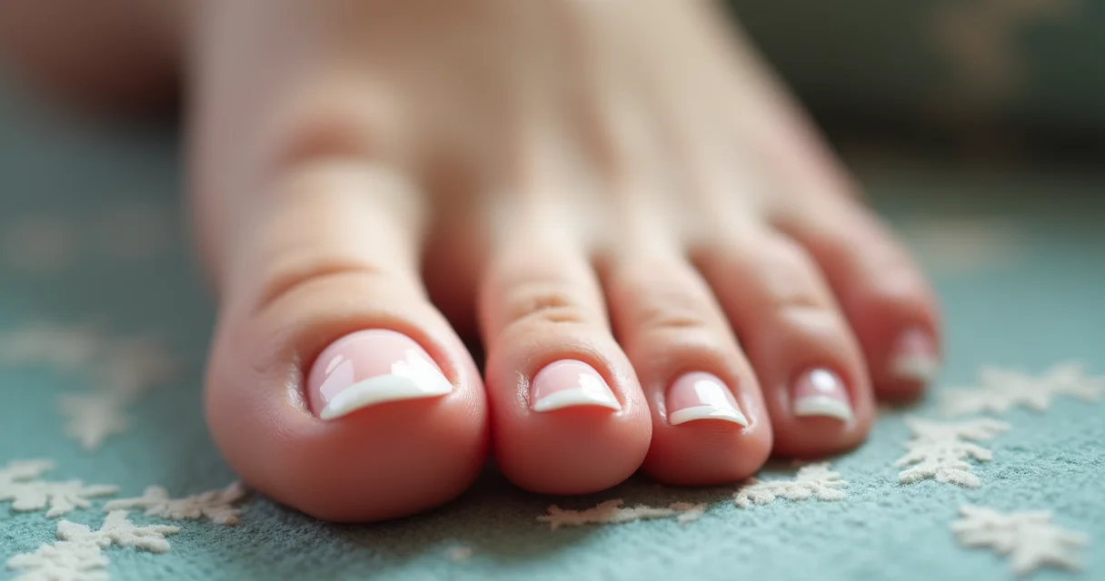 Close-up de uma unha do pé com a clássica unha francesinha, apresentando uma linha branca nítida sobre uma base rosa pálido.