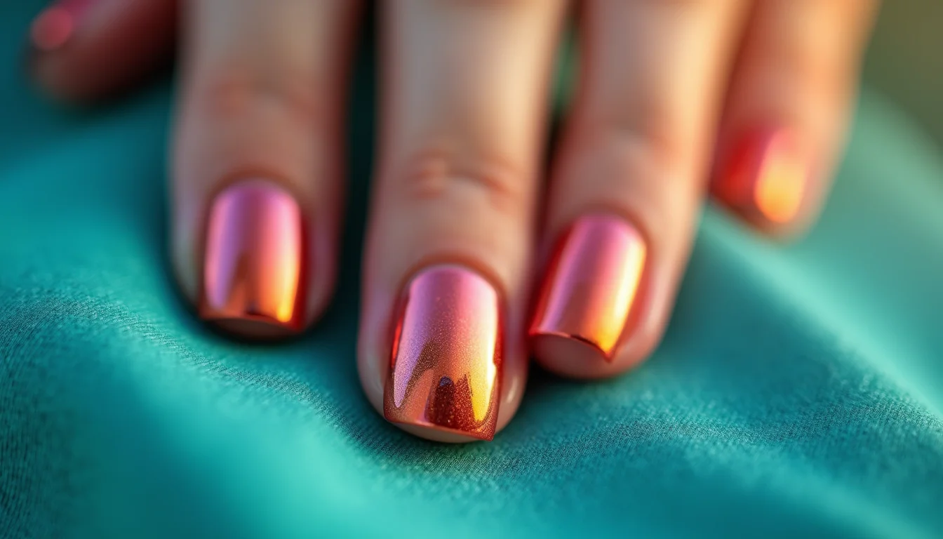 Experimente combinar o cromado com texturas opacas para criar contrastes ousados. A próxima fronteira é o metalizado com pigmentos camaleão, que mudam de cor conforme a luz.