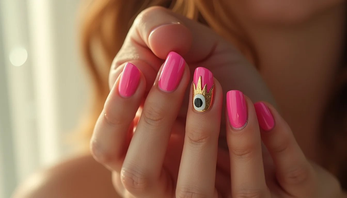O design de filha única com o olho grego rosa é um clássico que nunca falha. Ele destaca essa unha especial sem sobrecarregar o visual, mantendo a sofisticação.