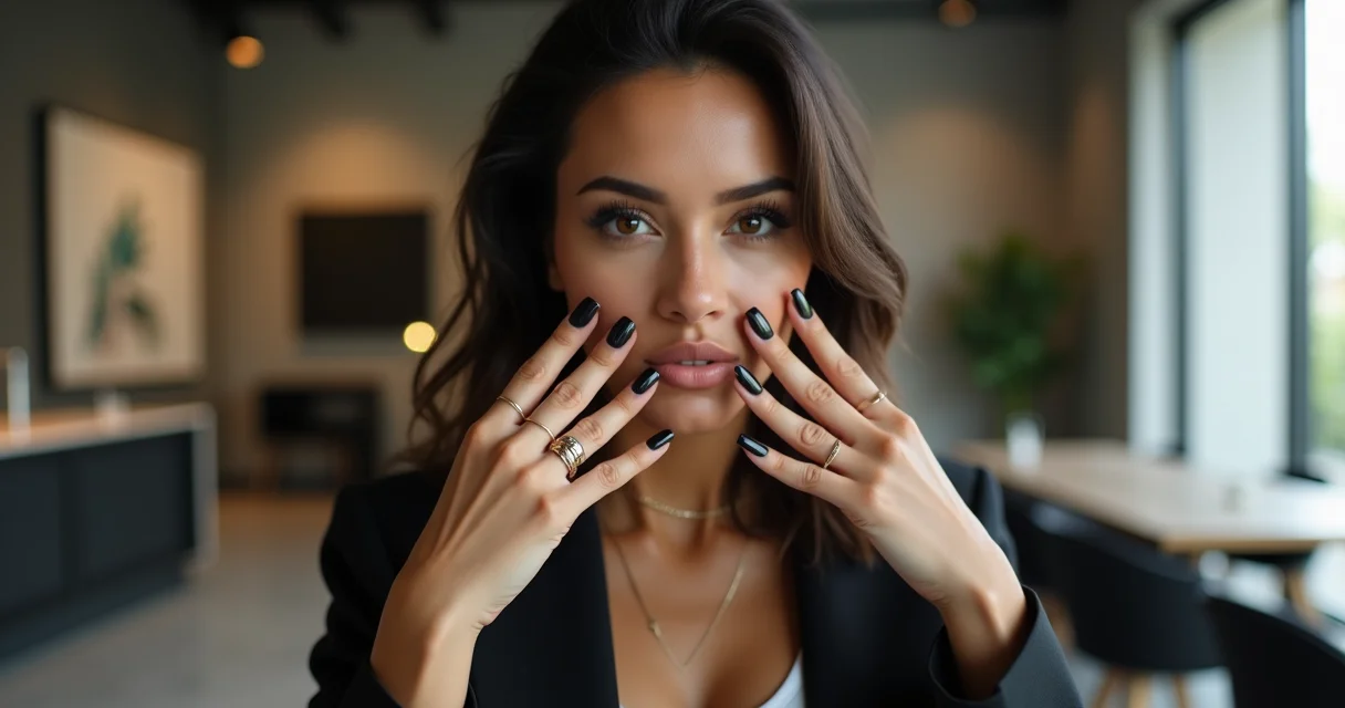 É um design que, apesar de simples, transmite uma sofisticação inegável. Perfeito para quem busca uma nail art preta discreta, mas com um toque de design. A gente adora porque é chique sem esforço, sabe?