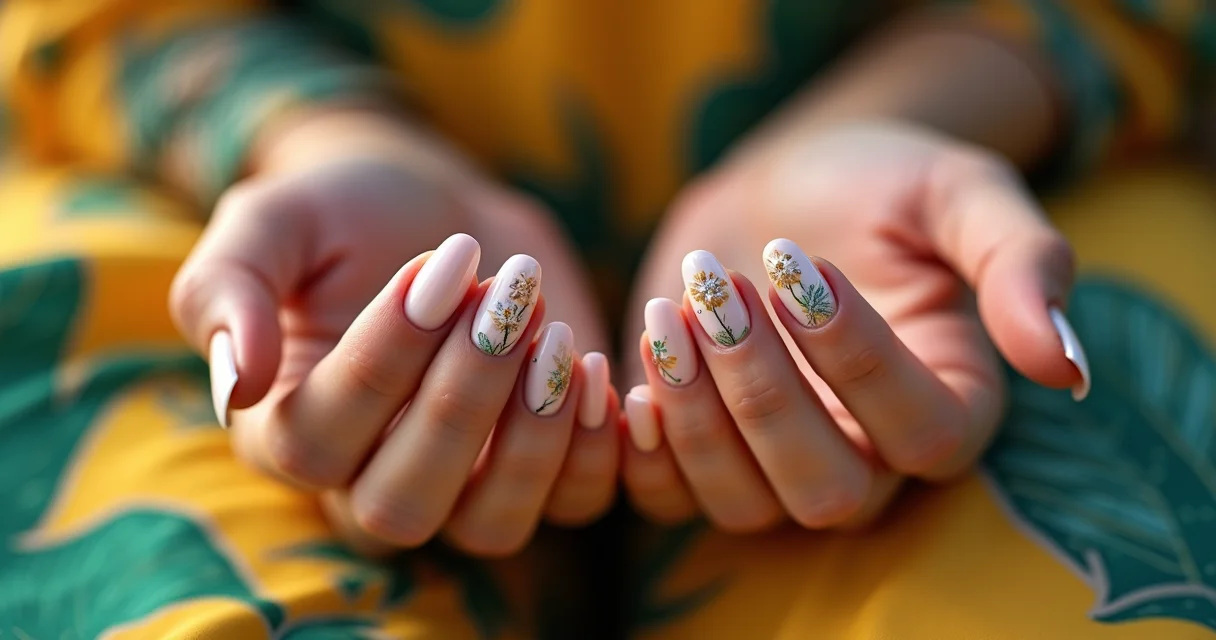 Base Nude com Detalhe: Uma unha em tom nude ou rosa bem clarinho, com um pequeno detalhe como uma folha minimalista ou um coração minúsculo, é a definição de